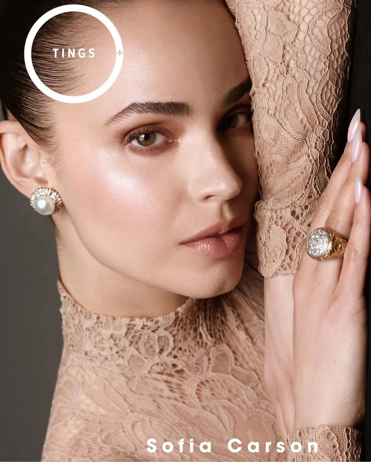 Sofia wears pearl and diamond jewelry for the cover of Tings magazine.